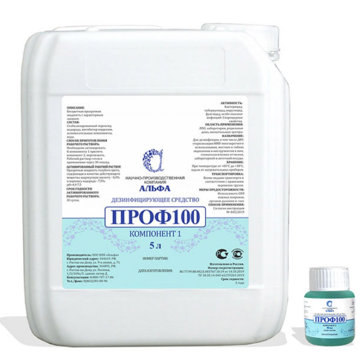 Состав: активированный рабочий раствор средства «ПРОФ100» содержит в качестве действующих веществ надуксусную кислоту- 0,3% и перекись водорода- 7,5%.